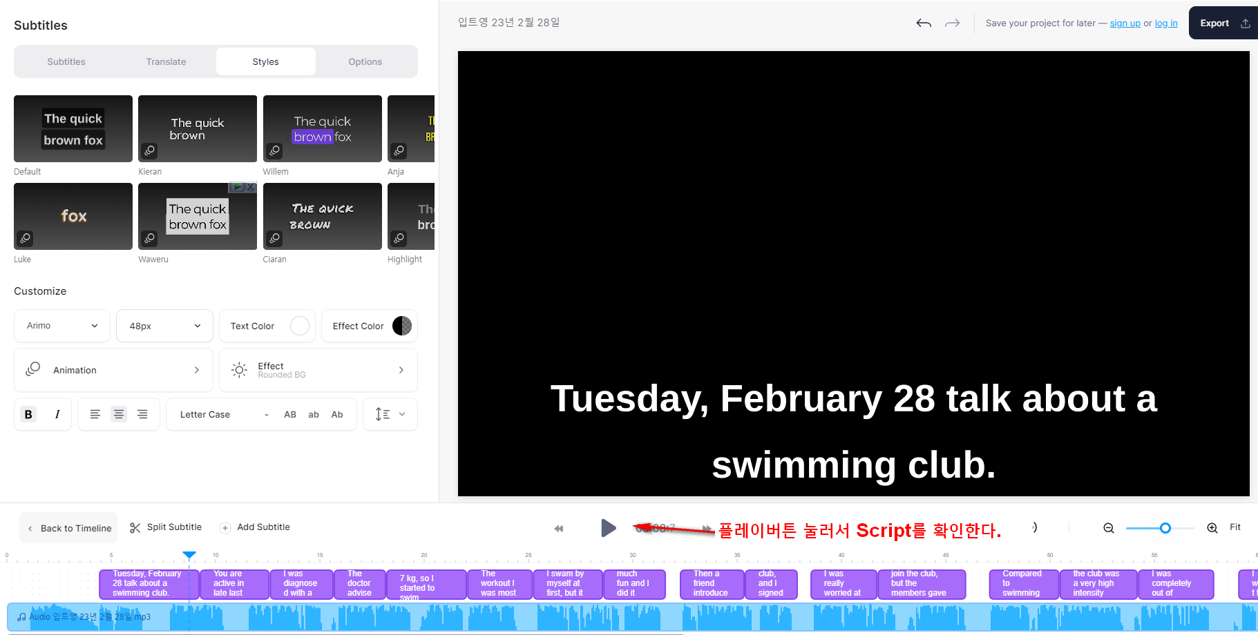 4.아래와 같이 자동으로 Script를 추출해 줍니다. 왼쪽 상단에 플레이 버튼을 클릭하시면 속도 조절과 함께 mp3를 들으면서 실시간으로 Script 확인이 가능합니다. (끝)