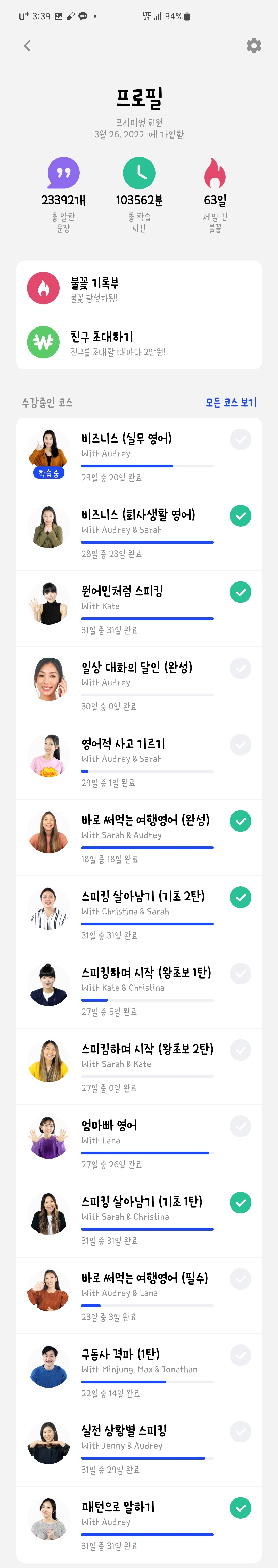 아래 보시다시피 거의 모든 코스를 수강했어요.